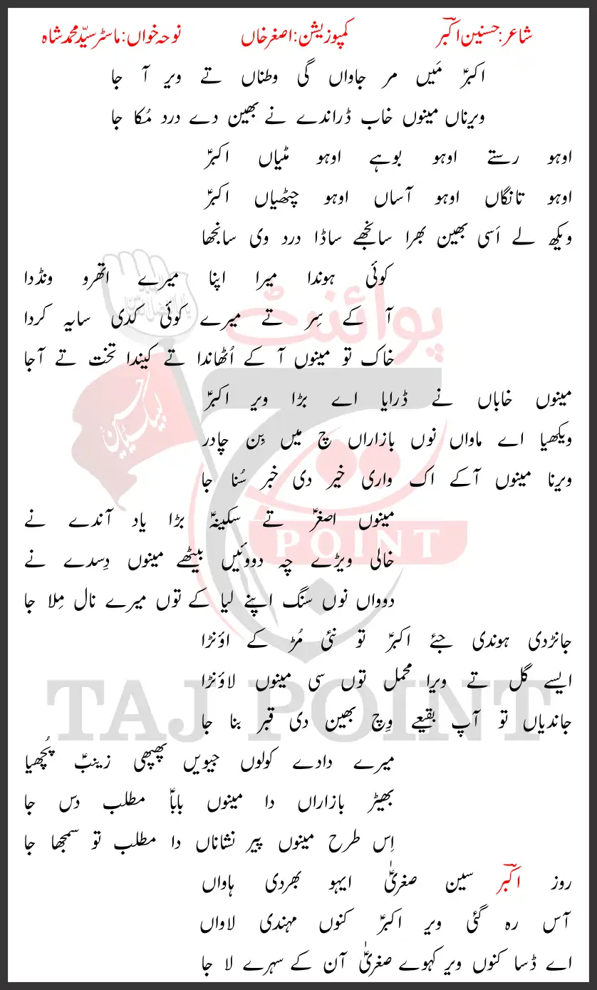 Assalam-o-Alaikum! Taj Point par khush-amdeed. Aaj hum is post mein Akbar Main Mar Jawangi Syed Mohammad Shah Lyrics Official 2024 ke mukammal lyrics share kar rahe hain. Yeh kalam Bibi Sughra SA Our Shehzada Ali Akbar AS Ka Wichora ke hawale se pesh kiya gaya hai.