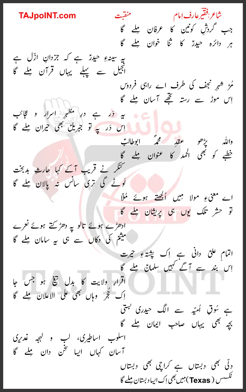 Assalam-o-Alaikum! Taj Point par khush-amdeed. Aaj hum is post mein Jab Gardish e Konain Ka Irfan Mile Ga Lyrics 2024 Best Manqabat ke mukammal lyrics share kar rahe hain. Yeh kalam Aal e Muhammad ke hawale se pesh kiya gaya hai.