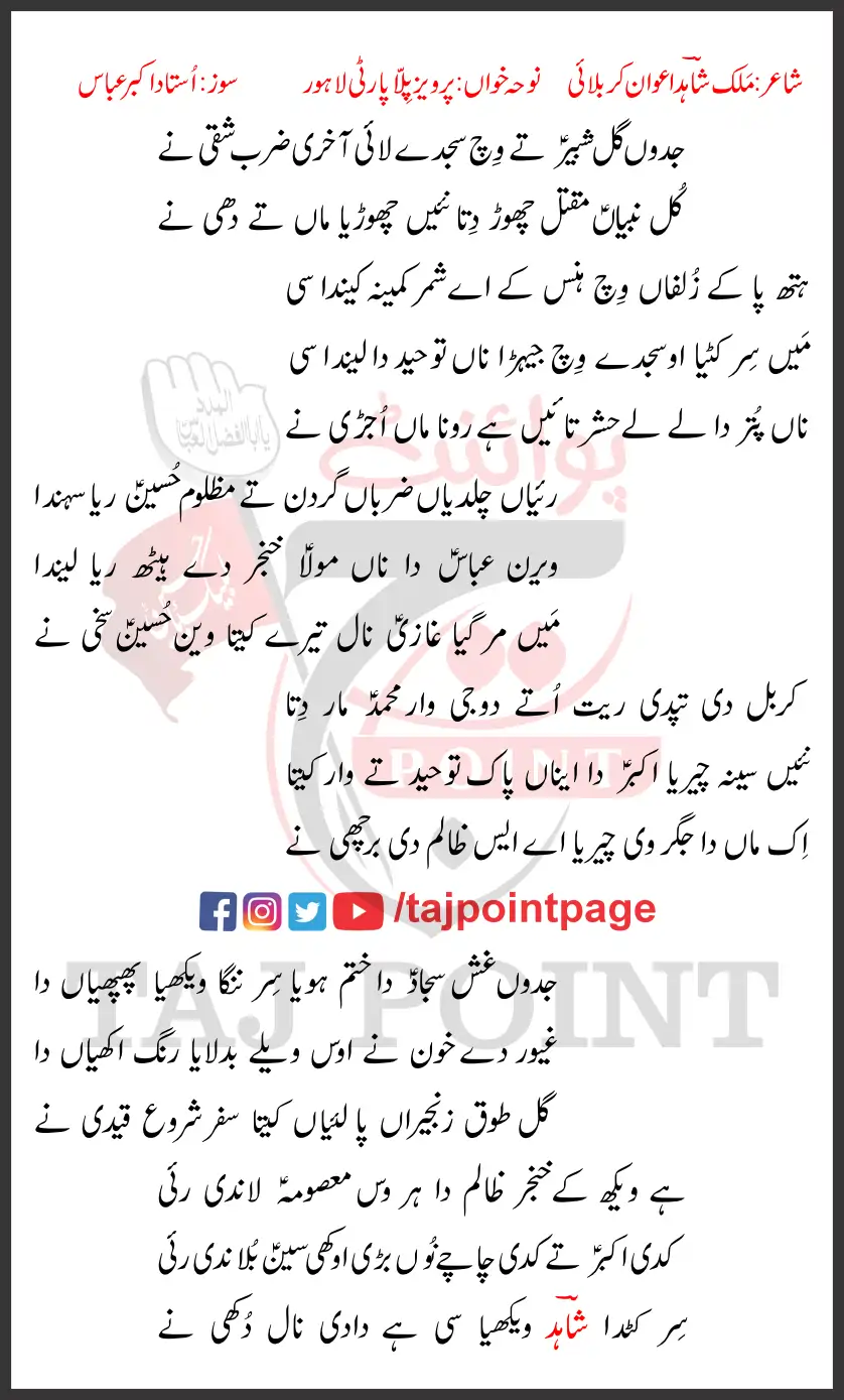 Assalam-o-Alaikum! Taj Point par khush-amdeed. Aaj hum is post mein Jadon Gal Shabbir Te Wich Sajday Layi Aakhri Zarab Shaqi Ne New Lyrics Punjabi 2025 ke mukammal lyrics share kar rahe hain. Yeh kalam Hazrat Imam Hussain AS ke hawale se pesh kiya gaya hai.