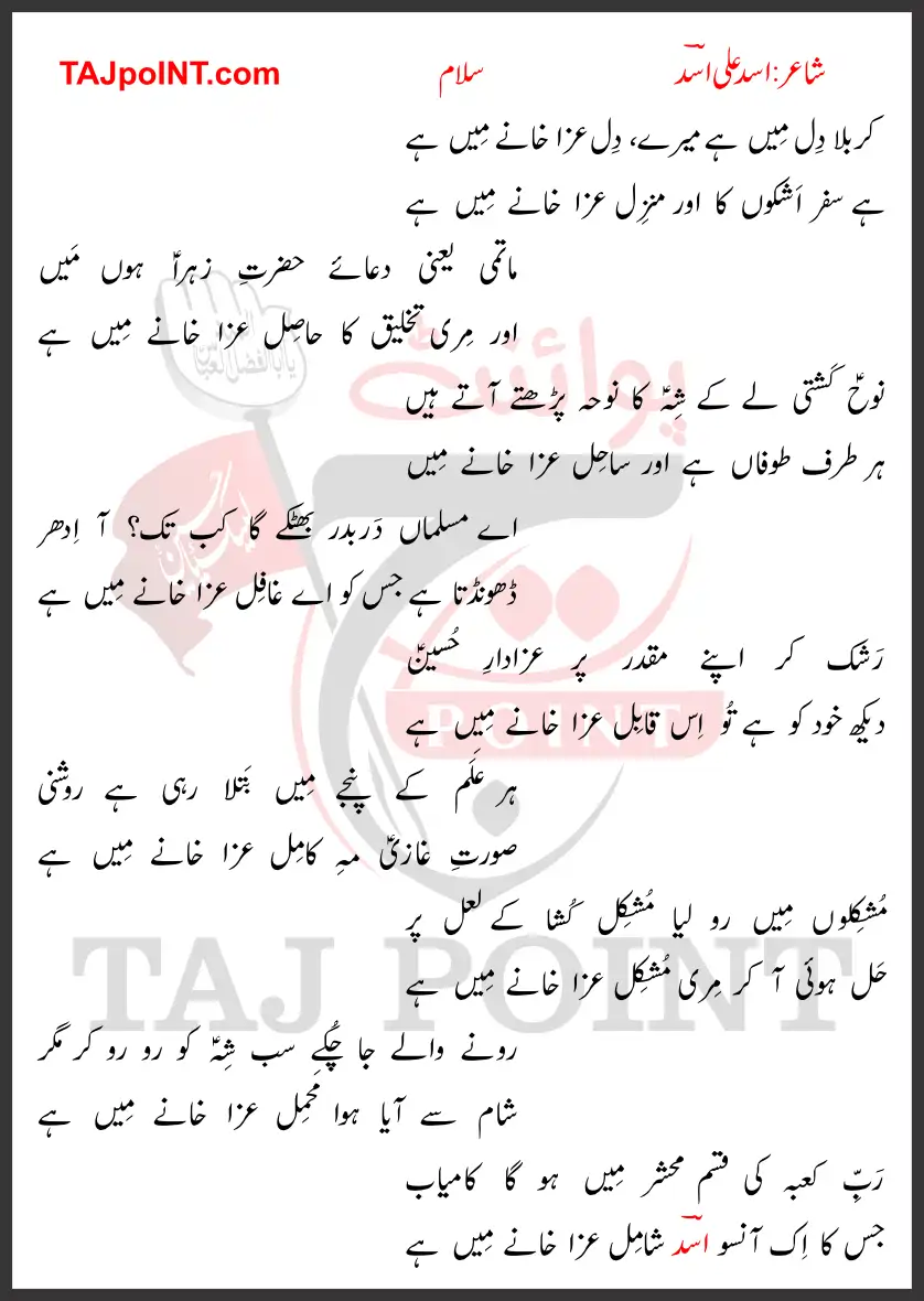 Assalam-o-Alaikum! Taj Point par khush-amdeed. Aaj hum is post mein Karbala Dill Mein Hai Mere Asad Ali Asad Lyrics 2024 New Salam ke mukammal lyrics share kar rahe hain. Yeh kalam Azza Khana ke hawale se pesh kiya gaya hai.