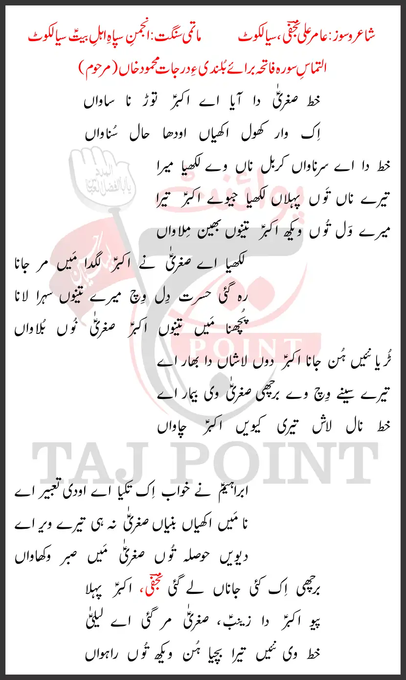 | Noha Name | Khat Sughra Da Aaya Aye Akbar Toor Na Sawaan Lyrics Punjabi 2025 New |