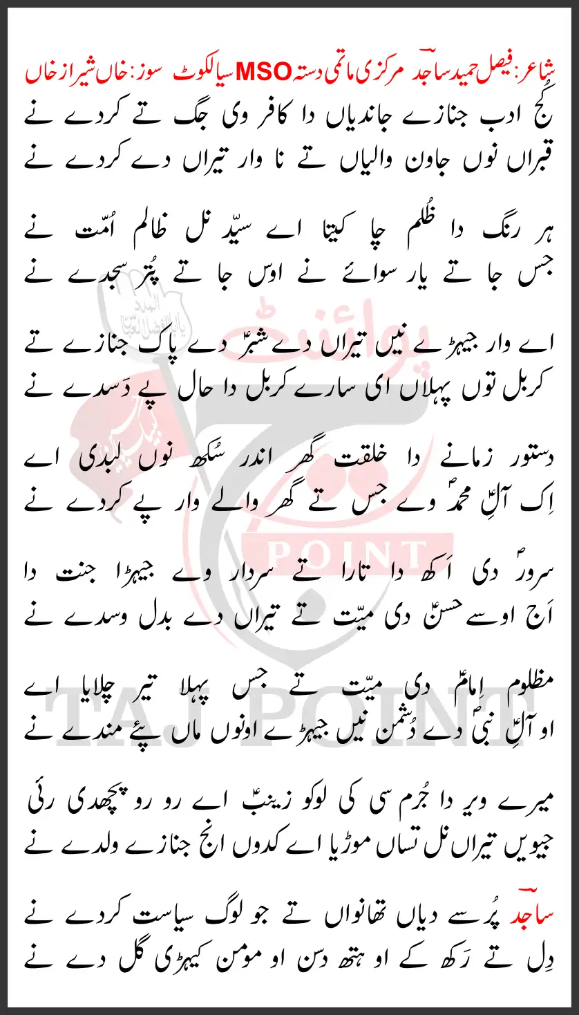 Assalam-o-Alaikum! Taj Point par khush-amdeed. Aaj hum is post mein Kuj Adab Janazey Jandiyaan Da Kafir V Jag Te Karde Ne New Lyrics 2024 ke mukammal lyrics share kar rahe hain. Yeh kalam 28 Safar Shahadat Imam Hasan ke hawale se pesh kiya gaya hai.