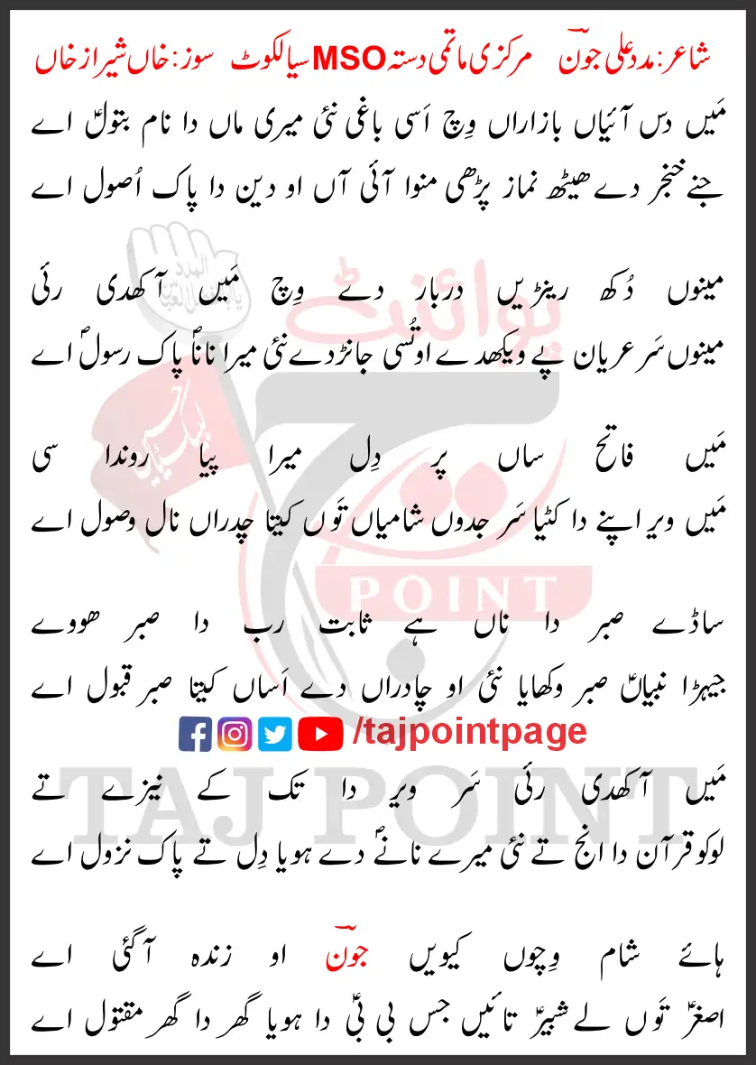 Assalam-o-Alaikum! Taj Point par khush-amdeed. Aaj hum is post mein Main Das Aaiyaan Bazaraan Wich Lyrics Punjabi 2021 Latest ke mukammal lyrics share kar rahe hain. Yeh kalam 20 Safar Chehlum ke hawale se pesh kiya gaya hai.