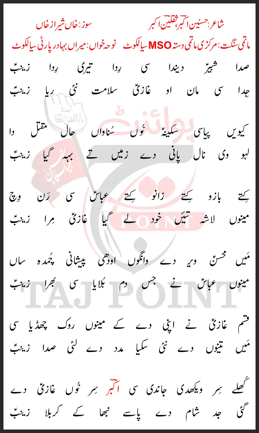 Assalam-o-Alaikum! Taj Point par khush-amdeed. Aaj hum is post mein Sada Shabir Denda Si Rida Teri Rida Zainab Lyrics Punjabi 2025 Latest ke mukammal lyrics share kar rahe hain. Yeh kalam Hazrat Ghazi Abbas Alamdar ke hawale se pesh kiya gaya hai.