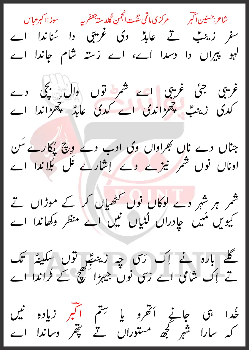 Assalam-o-Alaikum! Taj Point par khush-amdeed. Aaj hum is post mein Safar Zainab Tey Abid Di Gharebi Da Sonanda Aye 2024 Lyrics Bazar e Sham Noha ke mukammal lyrics share kar rahe hain jo ke Anjuman e Guldasta e Jafriya Lahore ne parha hai. Yeh ghamgeen kalam Bazar e Sham Noha ke masaib par mabni hai.