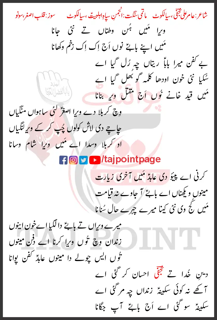 Assalam-o-Alaikum! Taj Point par khush-amdeed. Aaj hum is post mein Veera Main Hun Watna Te Nayi Jana Lyrics 2024 Latest ke mukammal lyrics share kar rahe hain. Yeh kalam 13 Safar Shahadat Bibi Sakina ke hawale se pesh kiya gaya hai.