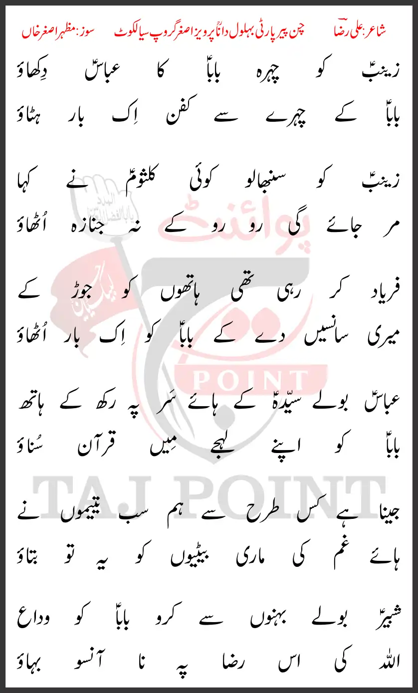 Zainab Ko Chehra Baba Ka Abbas Dikhao Lyrics New Noha Parveiz Asghar Khan Party Sialkot 24 Ramzan 1447 Hijri Lyrics in Urdu